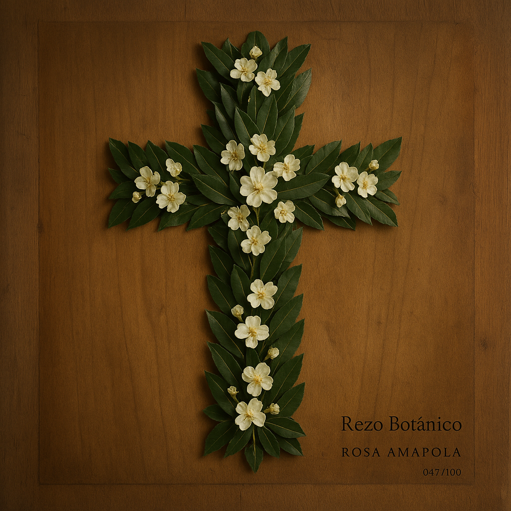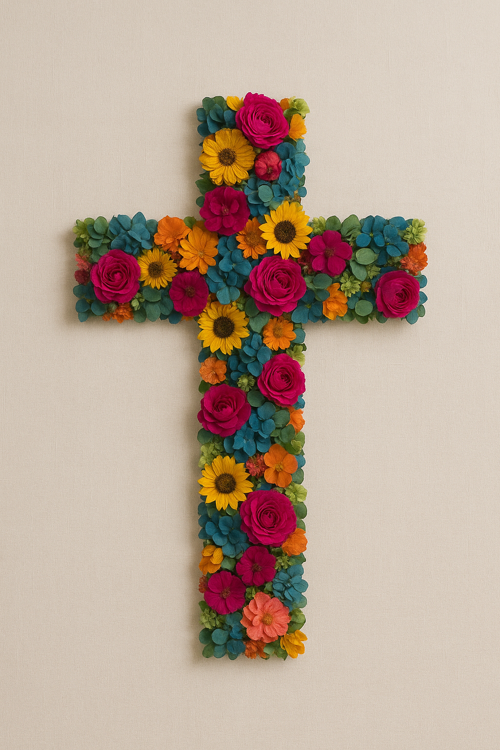 Cada cruz se elabora con flores preservadas de tonos vibrantes —rosas magentas, amarillos solares, naranjas de fuego, verdes de olivo y azules de cielo— sobre una base de lino natural, trabajada a mano.