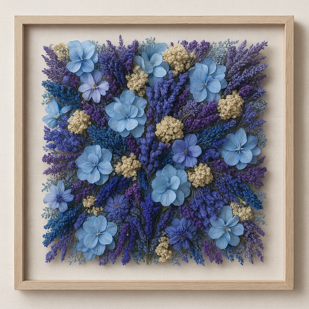 Gran pieza de 1,2 m con flores preservadas y marco artesanal.