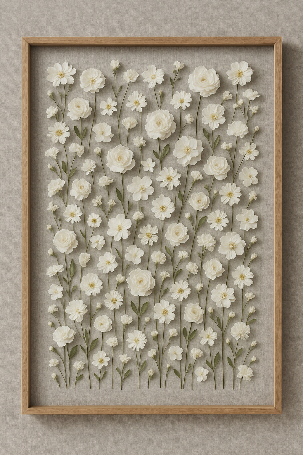 Flores preservadas con base de lino natural, ideal para capillas o espacios de recogimiento.